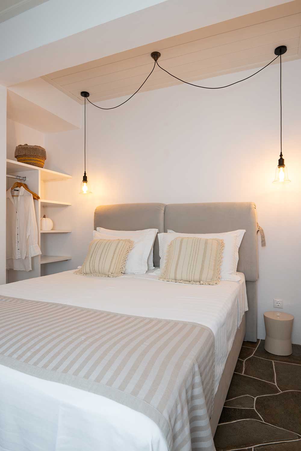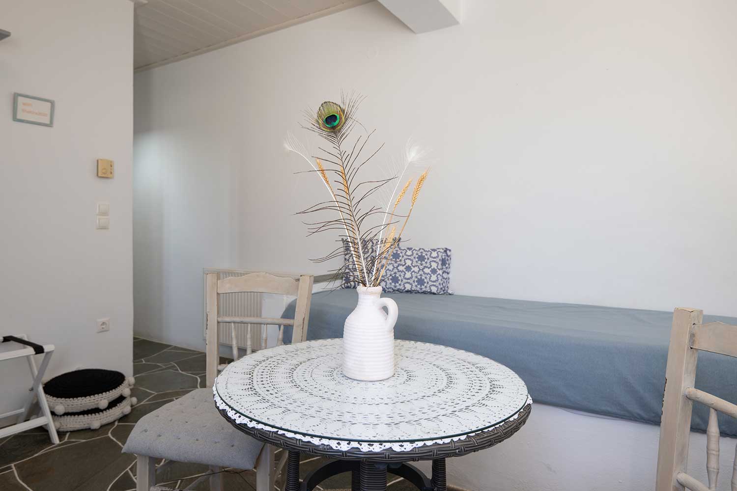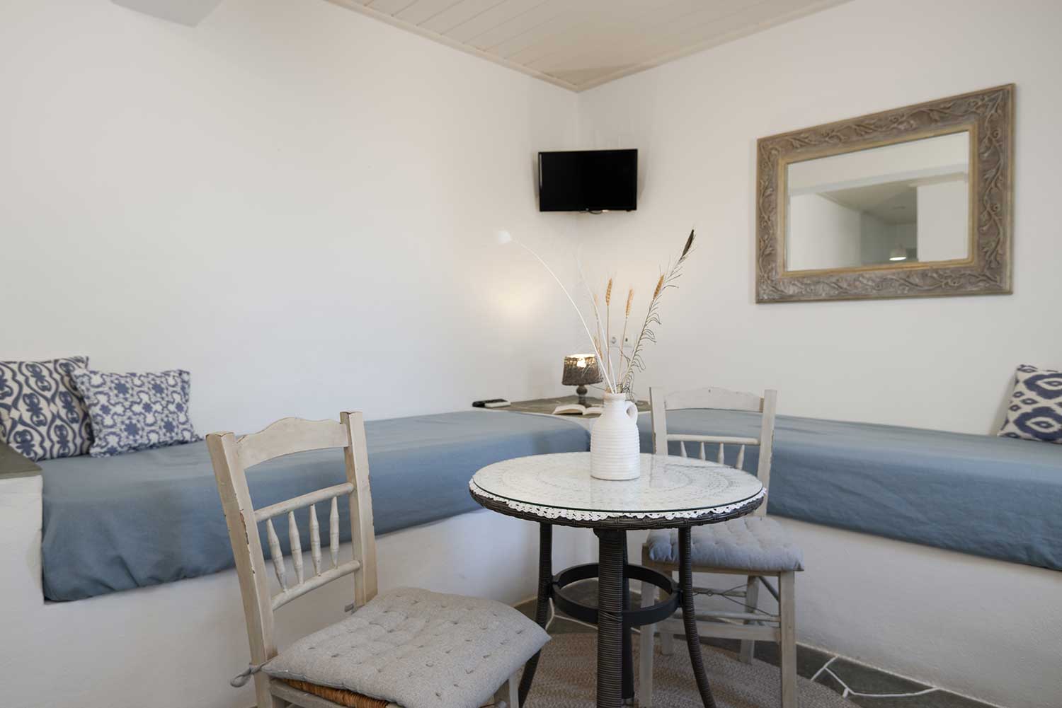 La cour privée de l’appartement est un endroit préféré — parfait pour savourer votre petit-déjeuner ou admirer la vue sur les villages environnants et le lever du soleil baignant la mer Égée de lumière.